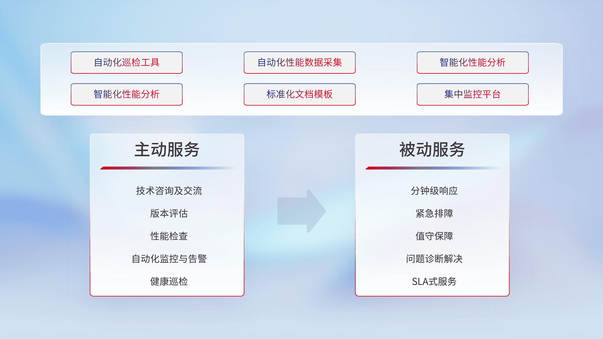 智能化工具和标准化文档,,,保障服务质量,,,,提供主动服务(包含技术咨询、、、版本评估、、性能检查、、、自动化监控与告警、、、、健康巡检)和被动服务包含(分钟级响应、、、、紧急排障、、、值守保障、、、、问题诊断解决、、SLA服务)。。